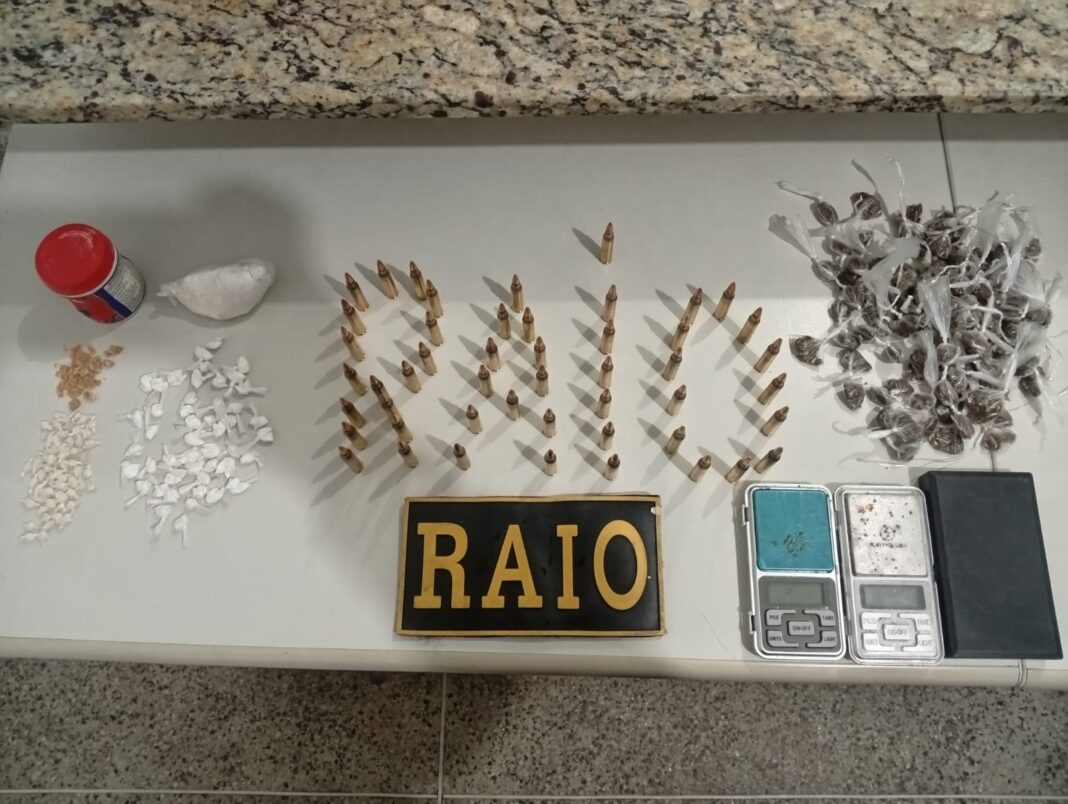 “Foram apreendidas 49 munições intactas de fuzil calibre 5,56, além de 53 gramas de cocaína, 60 gramas de maconha, 0,9 grama de crack e três balanças de precisão.”