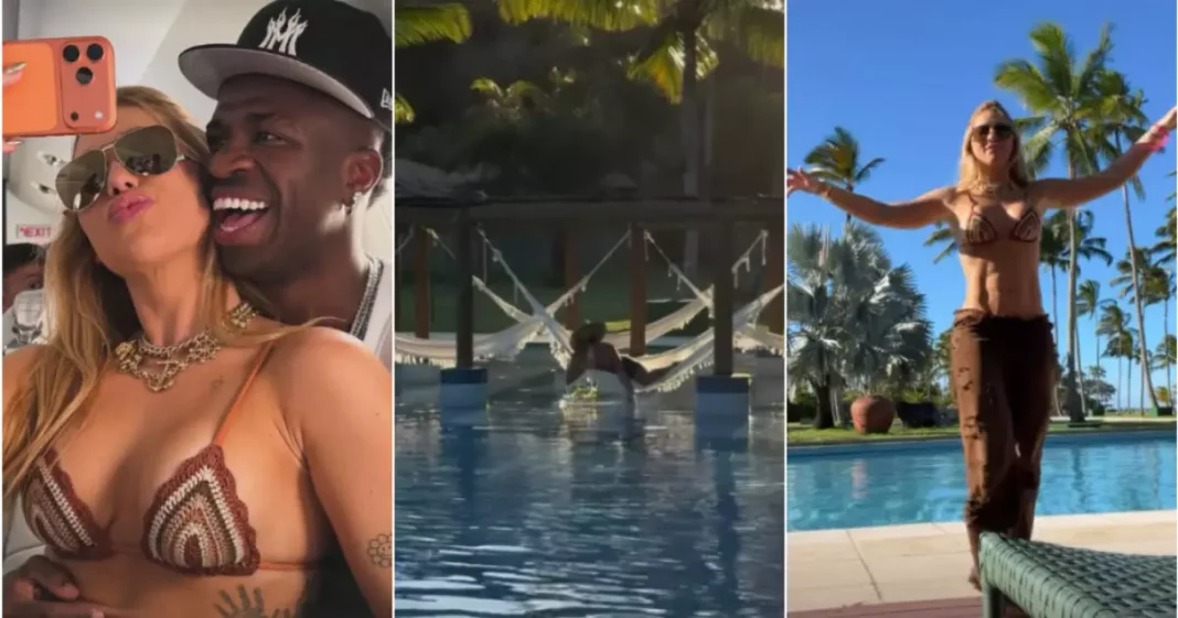 No Instagram, Virginia compartilhou imagens do bangalô decorado para o Ano-Novo, enquanto Vini Jr. destacou a vista para o mar cristalino que cerca a propriedade baiana.